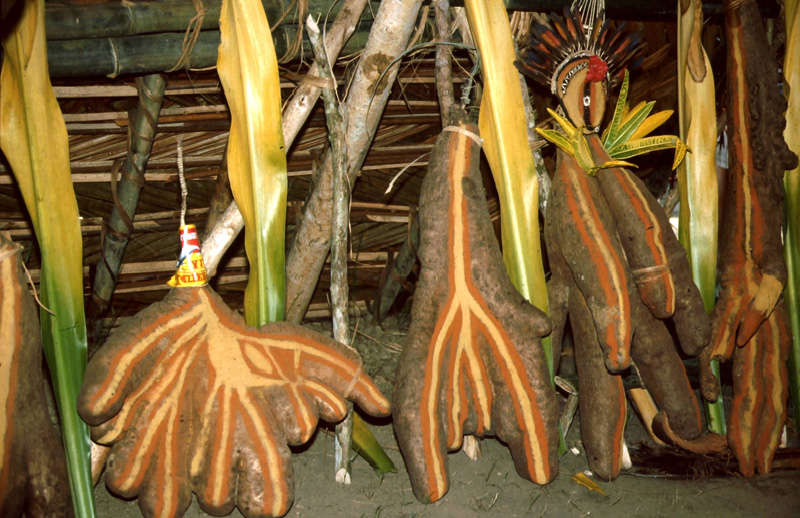 At harvest time the largest and longest of the yams of each clan is decorated with wooden or cane masks, painted with red, yellow, black and white