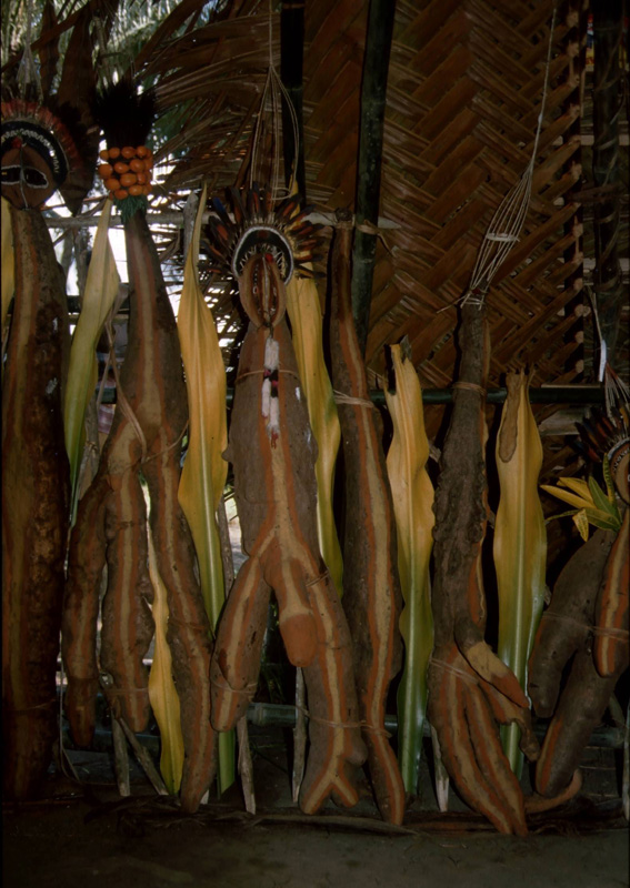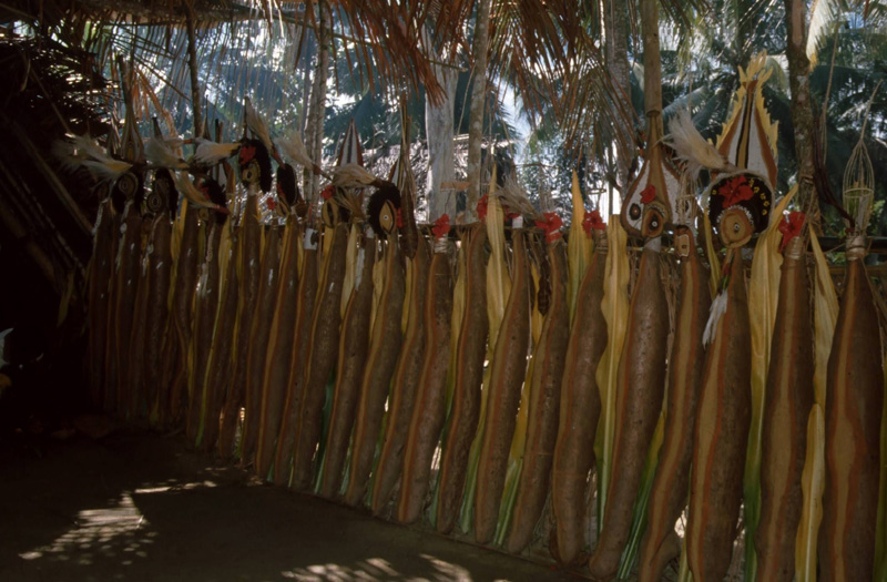 Usually the long yams are tied to poles and displayed on the place in front of the cult house. The men who have grown them exchange their yams with a partner